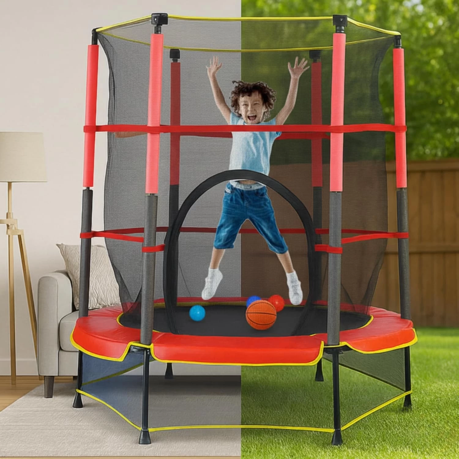Strong and sturdy trampoline with a safety net that ensures secure and worry-free play. Provides great fun while helping kids stay active and improve balance and coordination. Perfect for both indoor and outdoor use, offering endless energy-filled entertainment.
